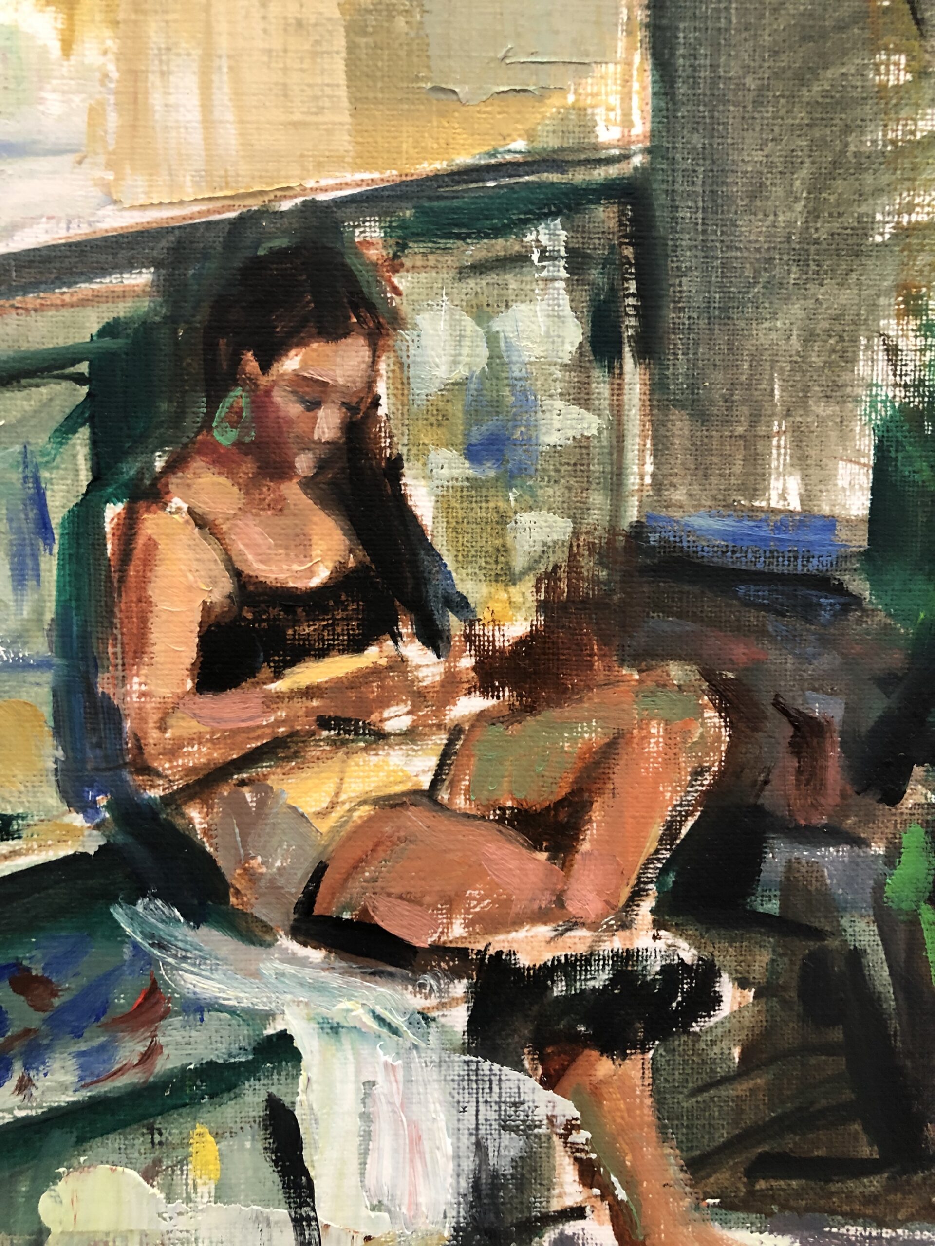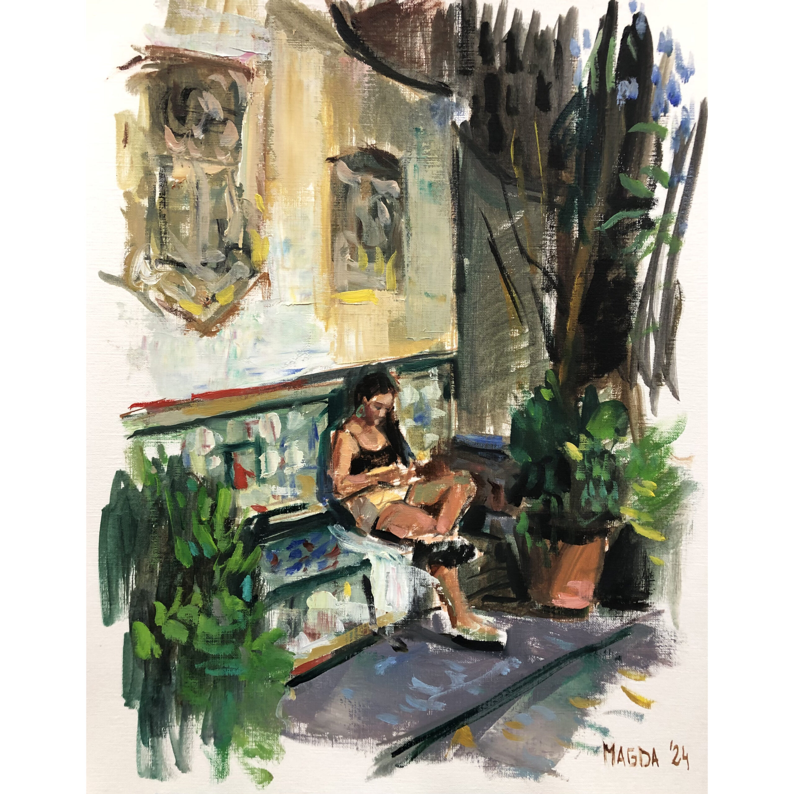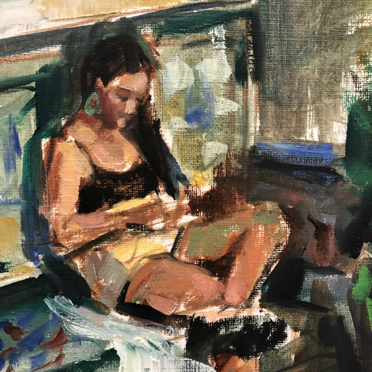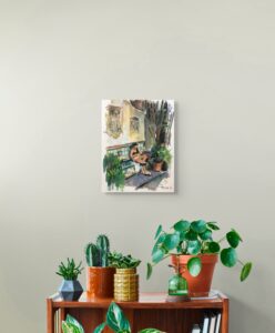 Bajo el sol nació de uno de esos bocetos espontáneos. Quise dar una mirada femenina distinta, lejos de las poses de revista: la protagonista aparece en una escena casual, recibiendo la calidez del sol pero absorta en sí misma, con la cabeza baja, sin atender a unas vistas que intuimos deliciosas. Esa postura y esa actitud sugieren una historia que se extiende más allá de los límites del papel y que cada espectador puede completar a su manera.