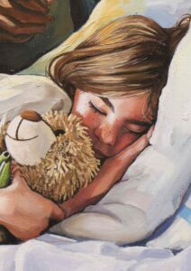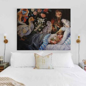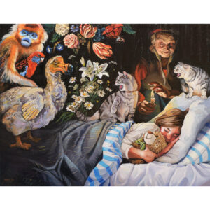 En esta obra, El sueño de Alicia, una niña duerme mientras, a la izquierda, un séquito de animales pintorescos encabezados por un dodo la observa; en la derecha, unos gatos se sitúan en guardia. Son los mismos animales que participan en aquella “carrera loca” y, para mí, representan esa frontera donde el sueño infantil se topa con lo fantástico.