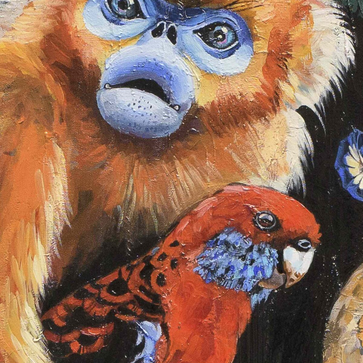 Detrás, una figura femenina madura —mi versión de la Reina de Corazones— vigila la escena. La tomé del cuadro Anciana y niño con velas (Rubens, 1616); su mirada alude a la pérdida de la belleza y las oportunidades que trae el paso del tiempo. Unas flores inspiradas en los bodegones flamencos completan el collage.