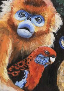 Aquí vemos dos de mis obsesiones de infancia: los animales y los cuentos. Cuando era niña y me quedaba en el pueblo con mis abuelos, mi abuela se asomaba cada noche para ver si dormía; si me costaba conciliar el sueño, me leía historias. Una de mis favoritas era Alicia en el País de las Maravillas, y de allí tomé este fragmento en el que el dodo propone correr para secarse: