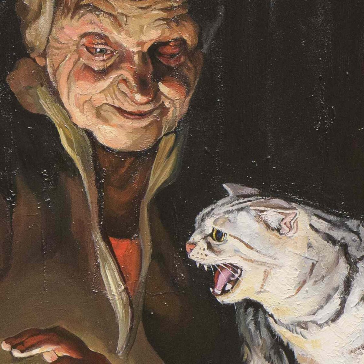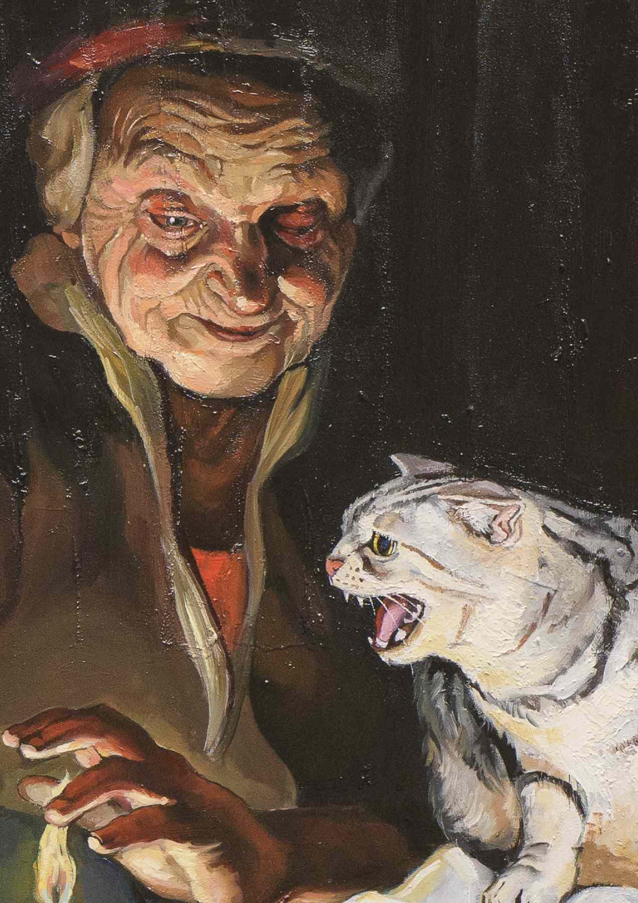 Aunque la atmósfera remite al barroco, trabajé con pinceladas duras y empastes marcados: sin veladuras, sin sutilezas. Quería que la materialidad del óleo chocara con lo onírico de la escena y dialogara con las nuevas técnicas digitales —esa libertad de organizar elementos casi como en Photoshop—. Los gatos, por su parte, son la resistencia de la infancia que se niega a entregarse al caos de la madurez
