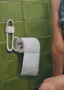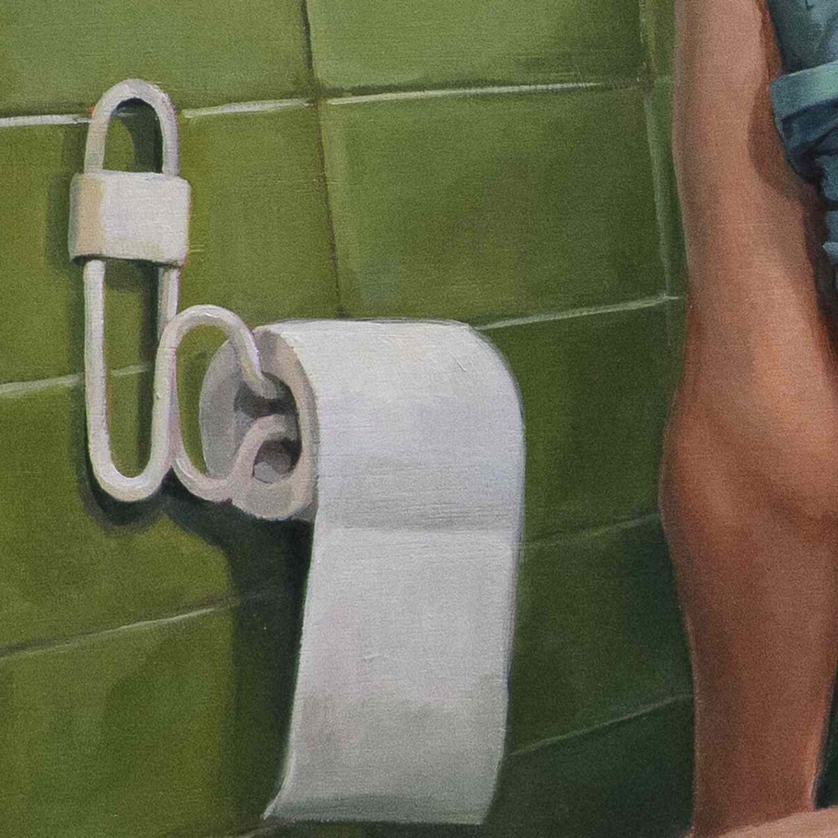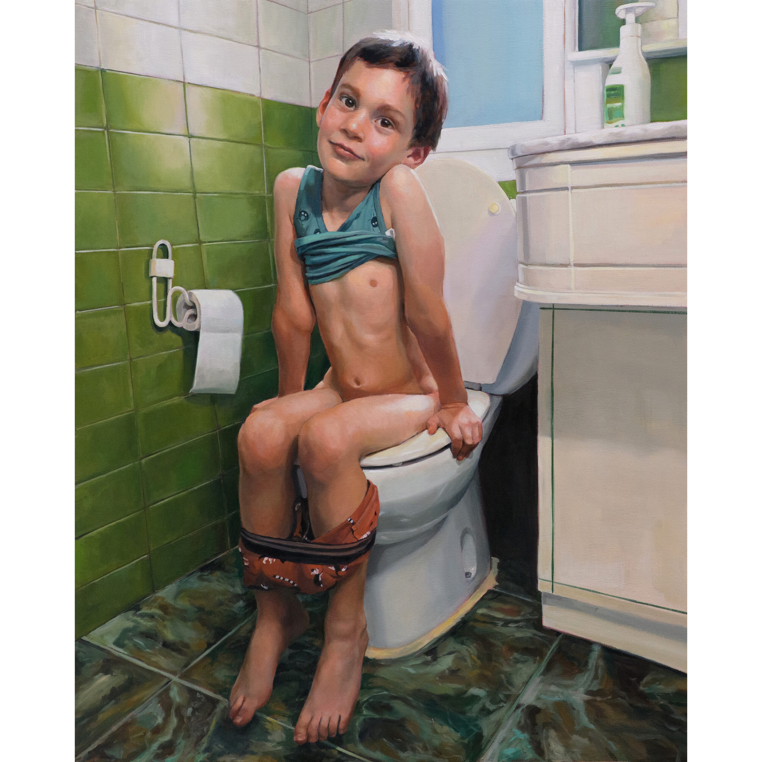 Inocencia natural retrata a mi hijo Noel en un instante íntimo y cotidiano de nuestra casa. Me fascina esa mirada directa con la que interpela al espectador, casi desafiándolo a reaccionar ante la falta de solemnidad de pintar a alguien sentado en el retrete: el baño, ese último bastión de privacidad donde escondemos la parte más “natural” para que no incomode.