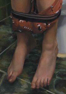 Tomé la foto sin intención de convertirla en pintura; solo quise capturar el momento antes de que creciera—una de esas imágenes que guardamos las madres cuando somos conscientes de lo rápido que pasa la infancia. Lo sé, suena tópico, pero así fue. En esa naturalidad sin complejos, cuando la necesidad de intimidad aún no existe, encuentro la belleza previa a los protocolos, los complejos y las defensas con que el mundo termina moldeándonos.