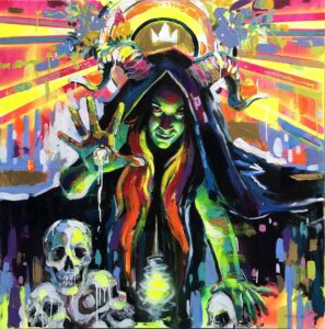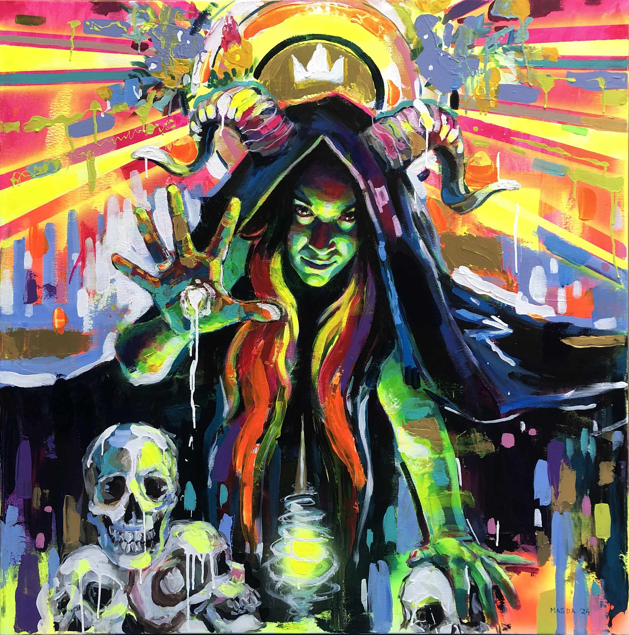 La Bruja cierra mi serie Bella Durmiente con una explosión de neón. Por primera vez me autorretrato como Maléfica: mirada desafiante, capa oscura, cuernos y una mano de la que gotea magia sobre calaveras. El huso apunta a mi rostro y, junto a una aureola dorada y una pequeña corona, refuerza la idea de poder.