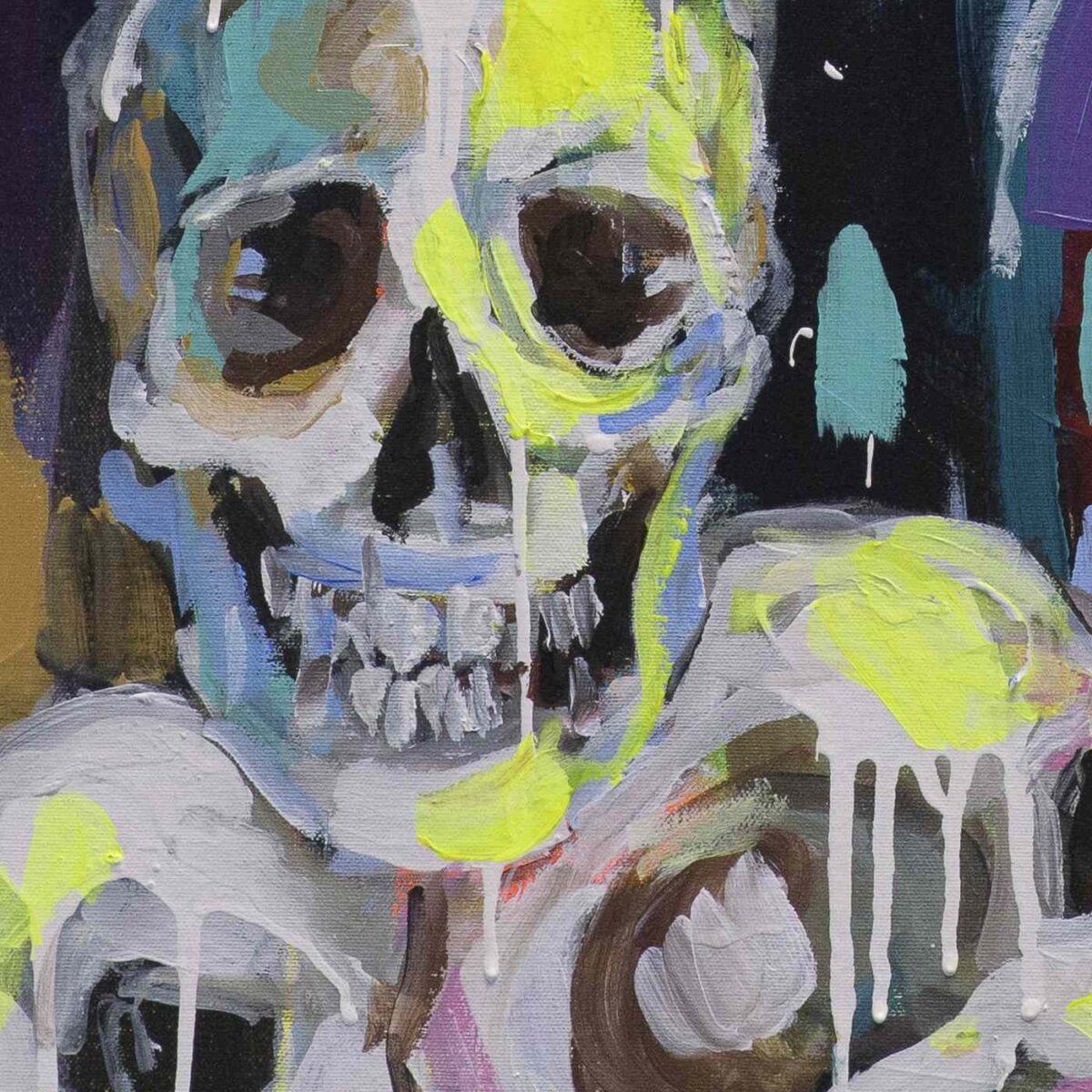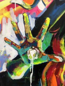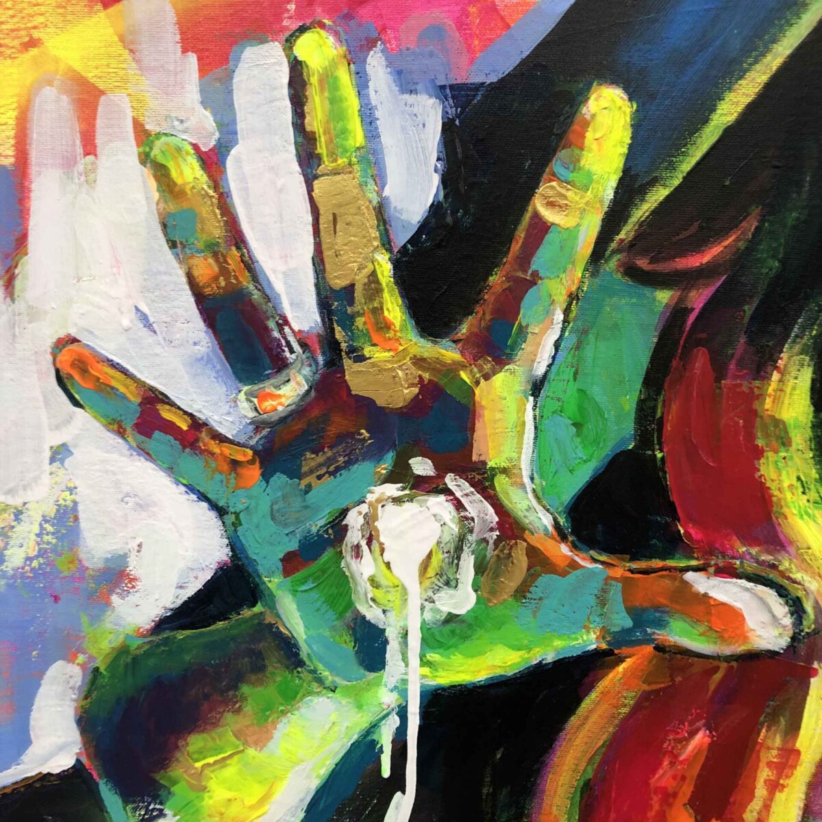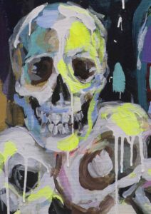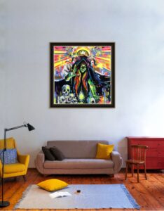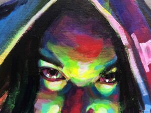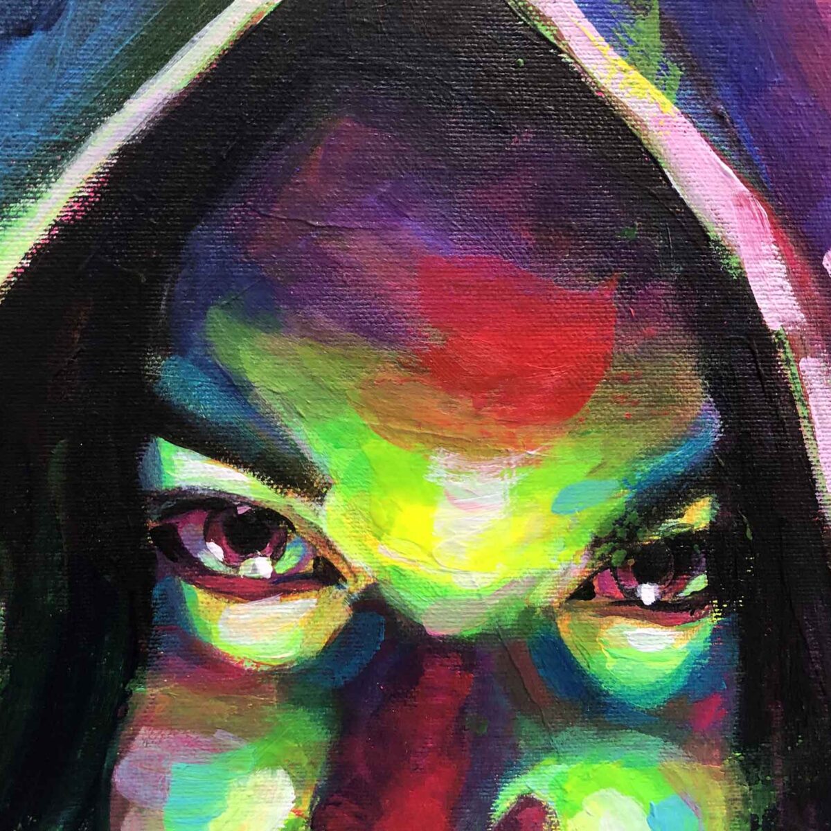 Por eso trabajé con pinceladas sueltas y casi agresivas, líneas rectas que aportan frialdad y una paleta aún más estridente que en el resto de la serie. El resultado es un autorretrato que celebra la parte oscura como parte inseparable de nosotros.