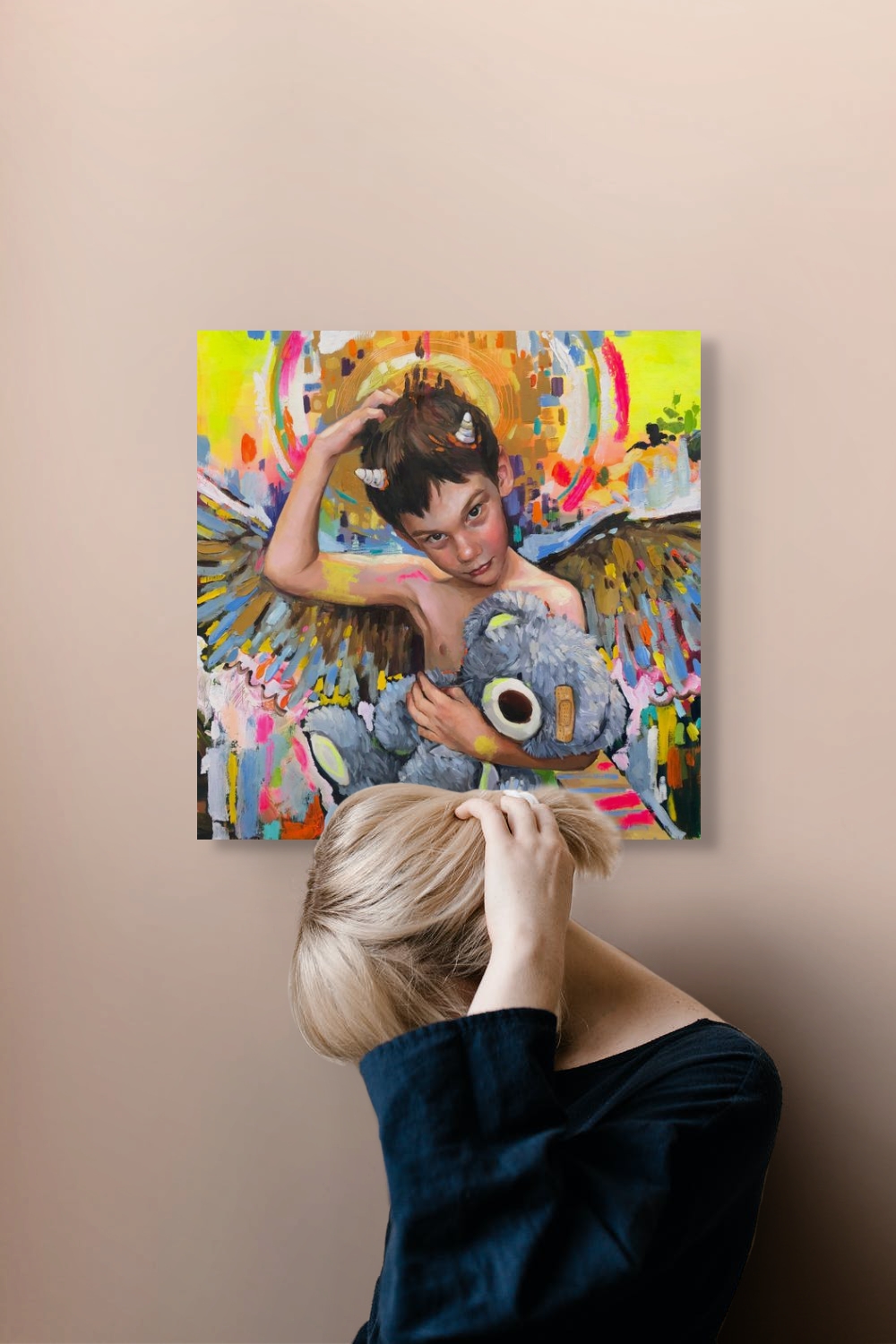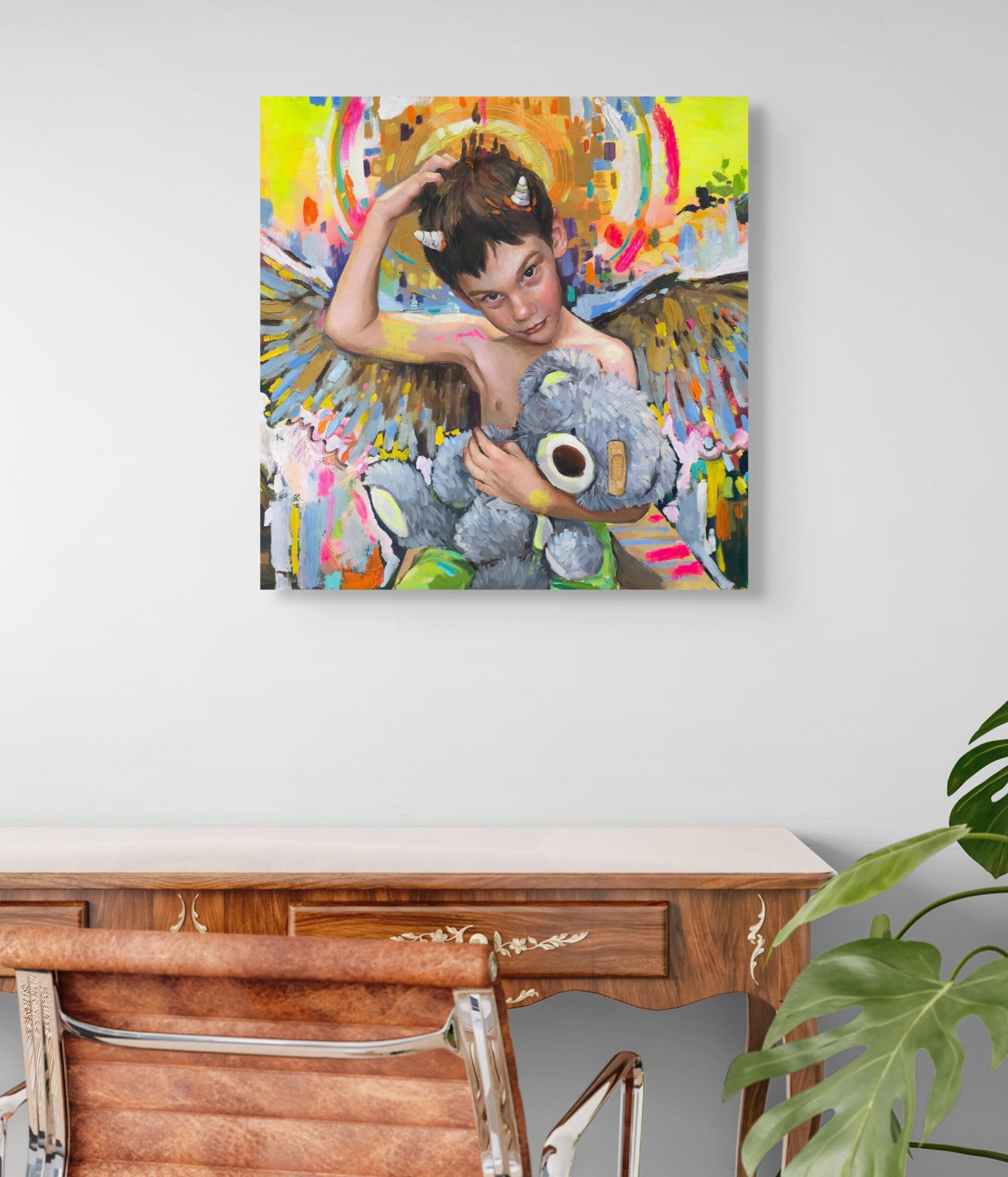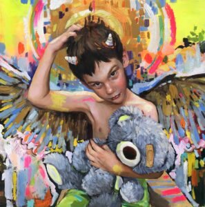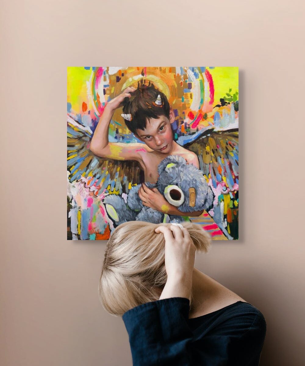 En Mi primer secreto empiezo a torcer la inocencia. Después de El príncipe feliz, El príncipe rana y Nido, este lienzo marca el primer desvío: la infancia deja de ser dulzura transparente y asoma el juego, el disimulo, el deseo. Mi hijo sigue siendo un ángel, pero le brotan cuernos pequeños, casi cómicos: la chispa inaugural de la rebeldía. Su mirada ya no se entrega; ahora retiene, guarda algo. El peluche, que antes era escudo, se convierte en testigo.