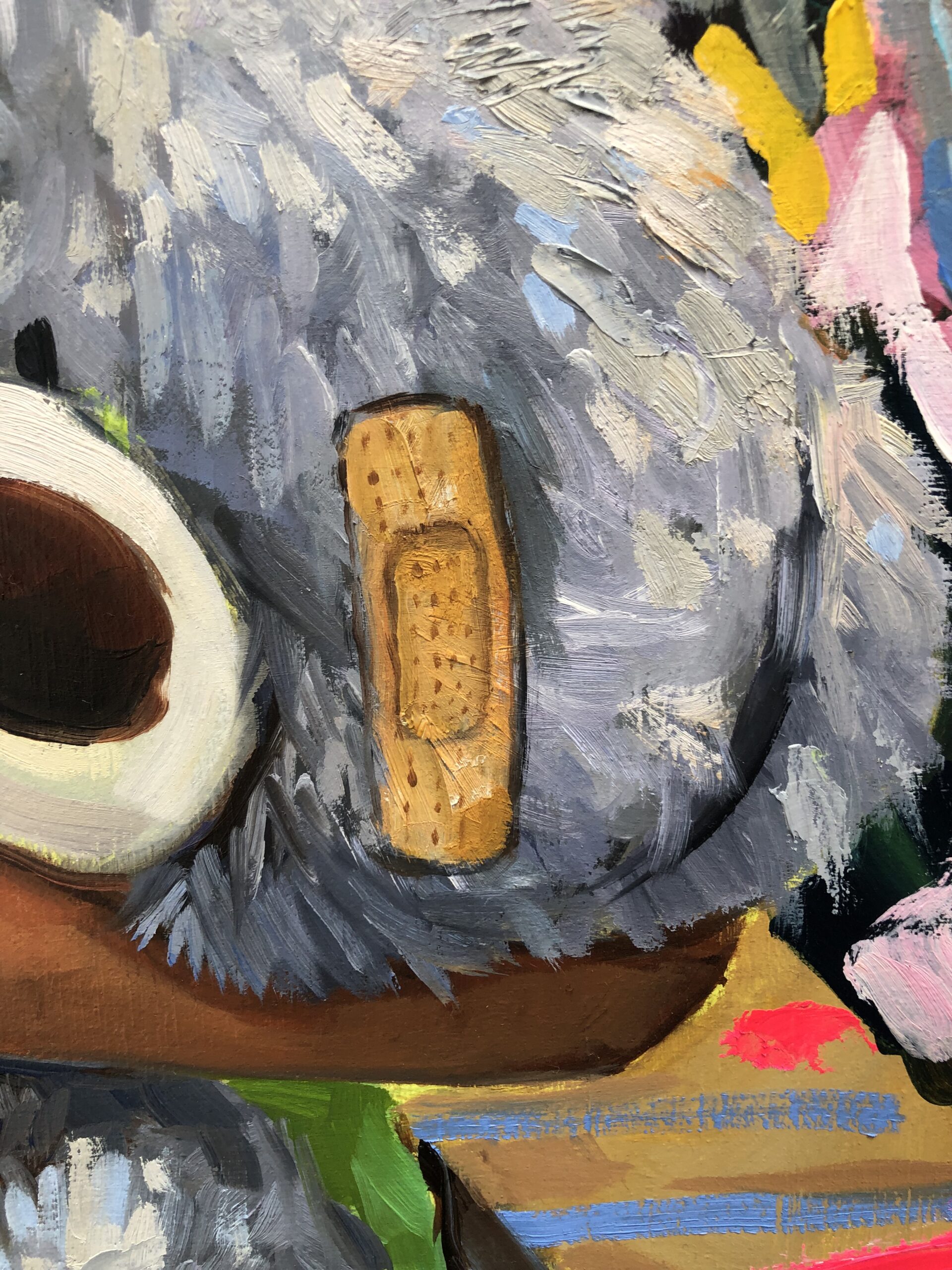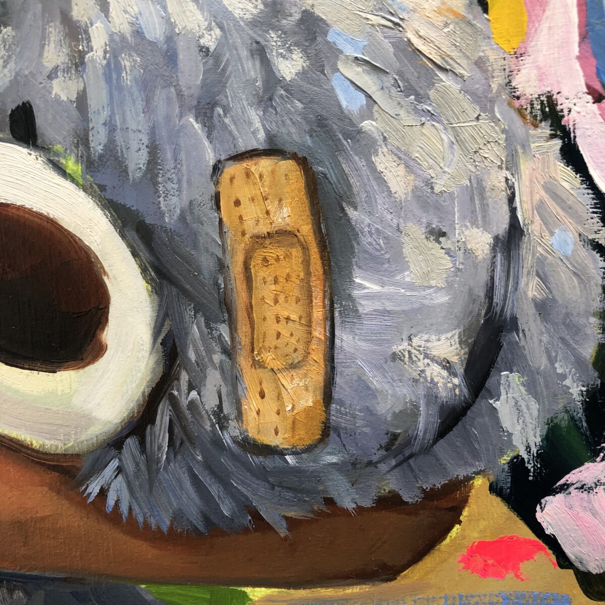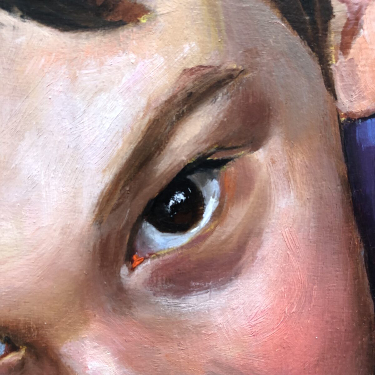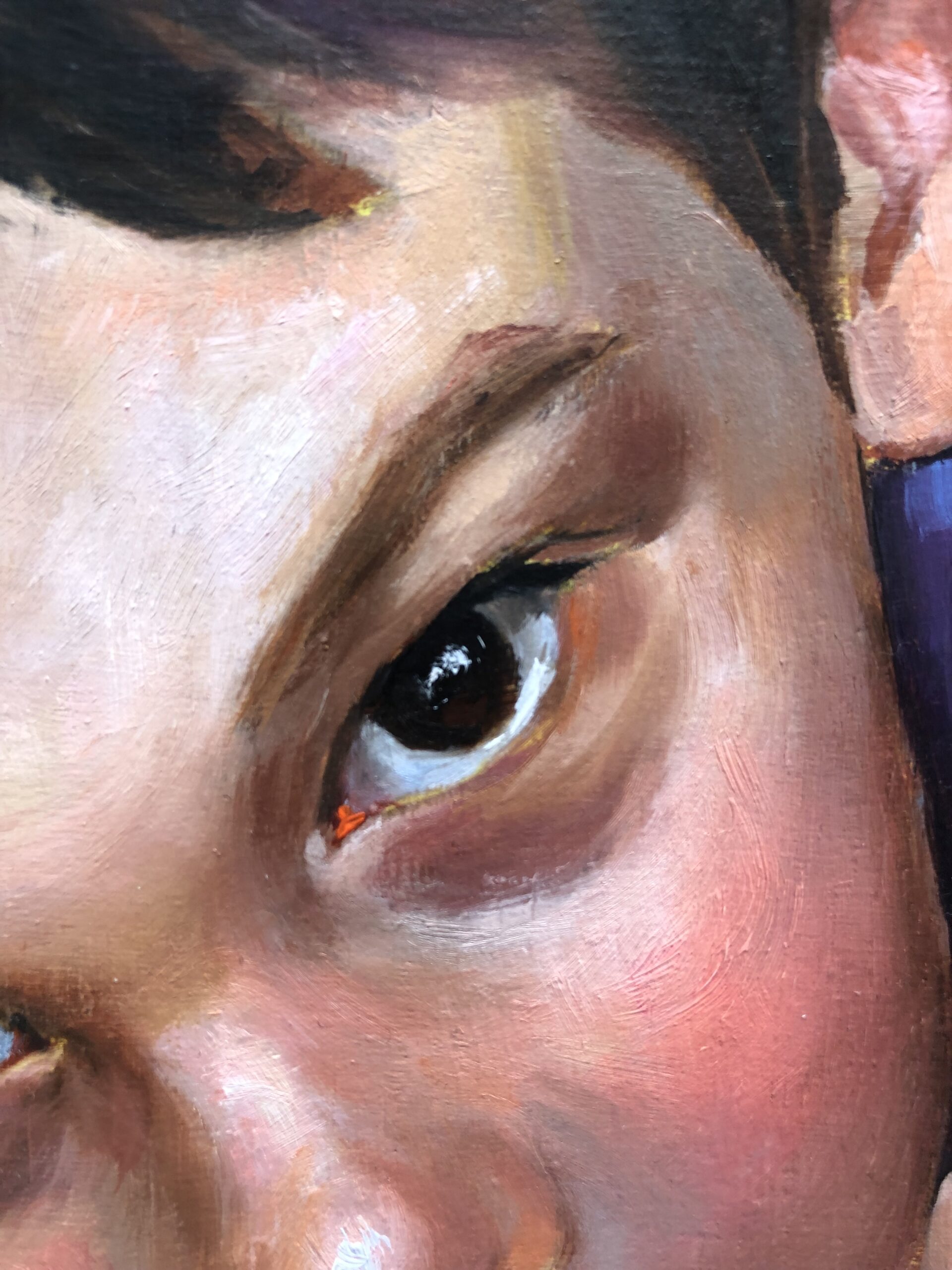 En Mi primer secreto empiezo a torcer la inocencia. Después de El príncipe feliz, El príncipe rana y Nido, este lienzo marca el primer desvío: la infancia deja de ser dulzura transparente y asoma el juego, el disimulo, el deseo. Mi hijo sigue siendo un ángel, pero le brotan cuernos pequeños, casi cómicos: la chispa inaugural de la rebeldía. Su mirada ya no se entrega; ahora retiene, guarda algo. El peluche, que antes era escudo, se convierte en testigo.