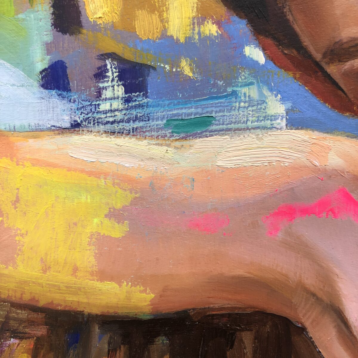 La pincelada vibra libre, eléctrica, casi salvaje en los fondos. Dejo que los colores exploten sin miedo, que se mezclen sin pedir permiso; esa energía revela un mundo interior que despierta, duda y se desborda.