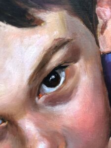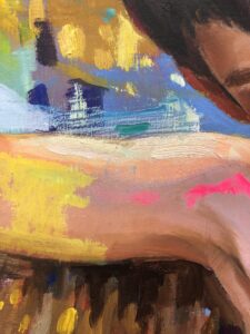 También pinto los bordes del lienzo. Como un susurro que rodea la escena, inscribo mandamientos («No asesinarás», «No mentirás», «Honrarás a tu padre y a tu madre», «No codiciarás»). Al principio no se ven, pero están ahí, rozando la conciencia del niño, todavía sin comprenderlos. Esas palabras convierten la obra en un campo de tensión entre lo puro y lo aprendido, entre el instinto y la norma. Ese primer secreto no es solo suyo: es el umbral del conflicto humano.