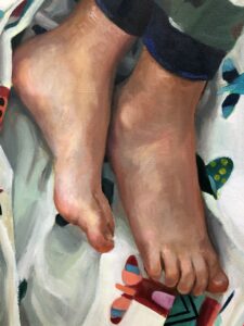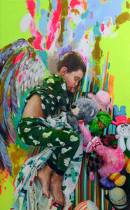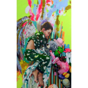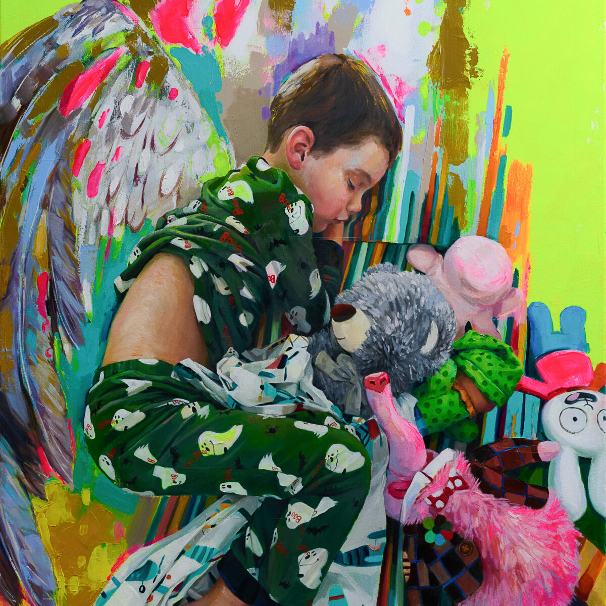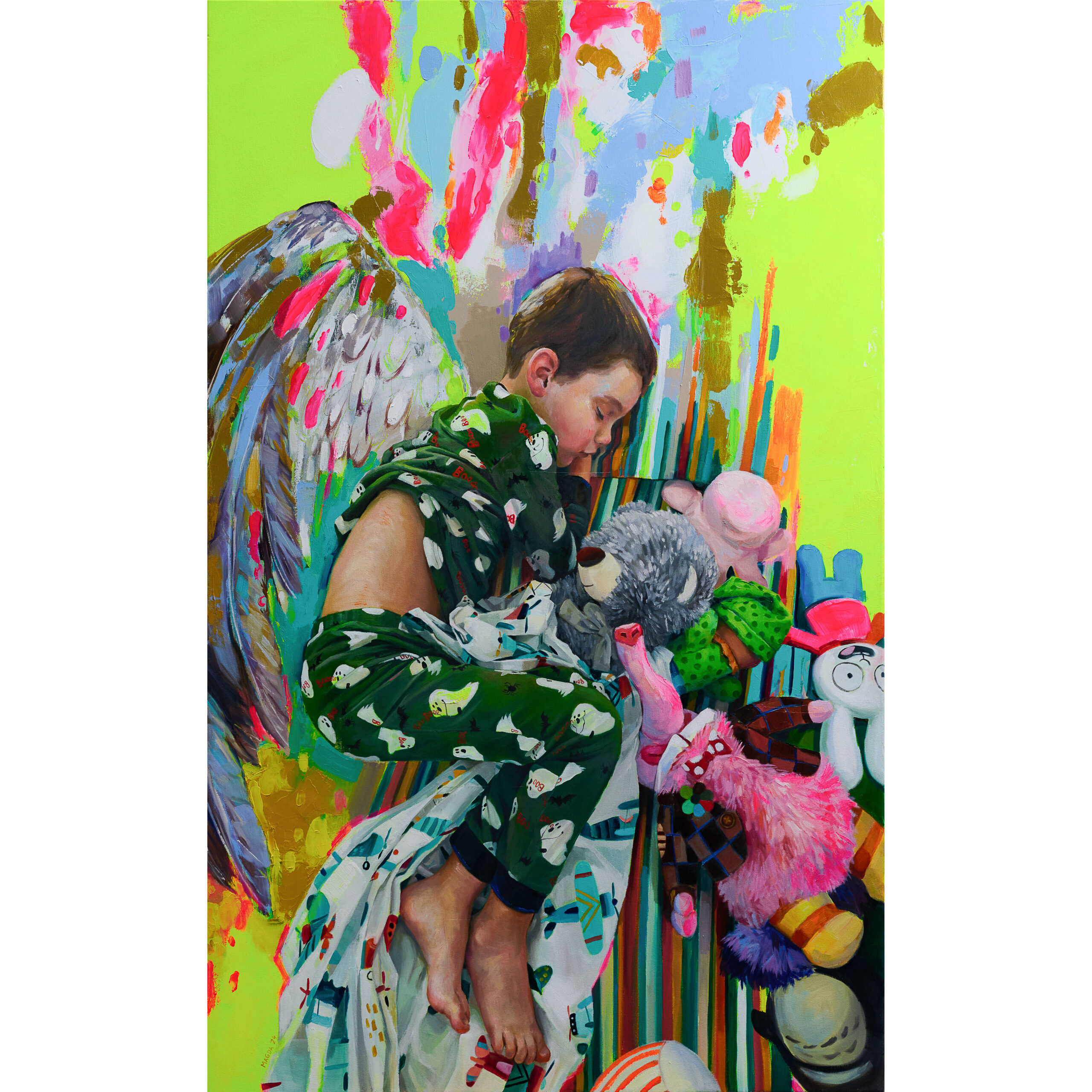 Del hombro de Noel brota un ala, símbolo de pureza e inocencia, aún libre de las imperfecciones que llegarán con la edad. El realismo de su cuerpo, la textura de las telas y la presencia tangible de los juguetes se entrelazan con la abstracción explosiva que envuelve la escena, recordándonos que dormir no es solo descansar: es crear, imaginar, volar.