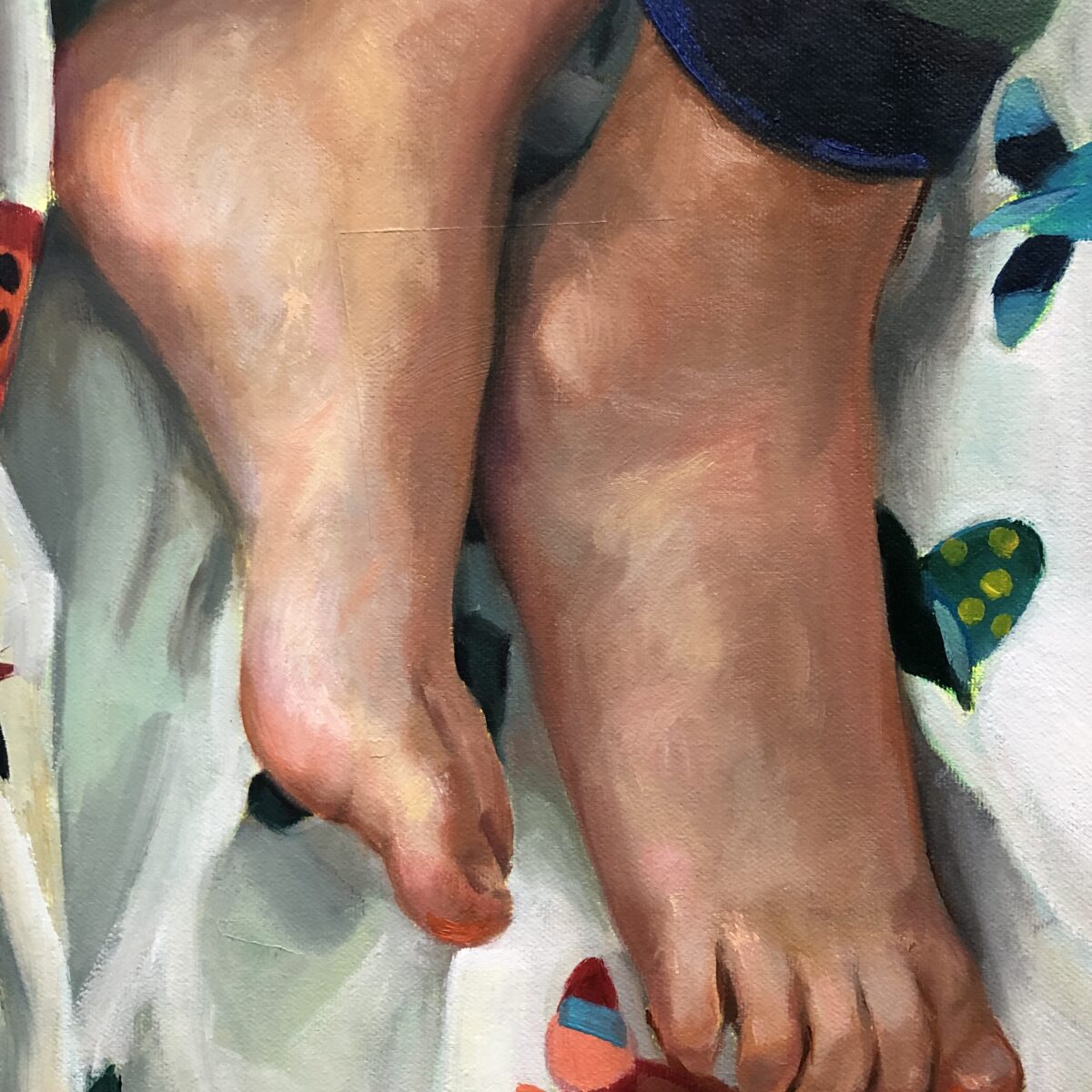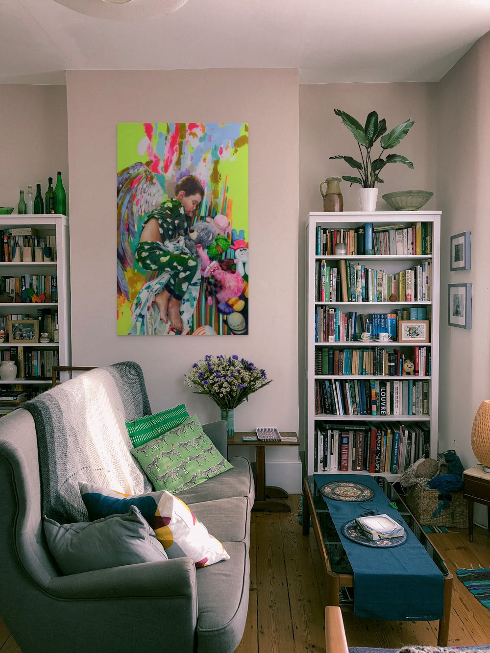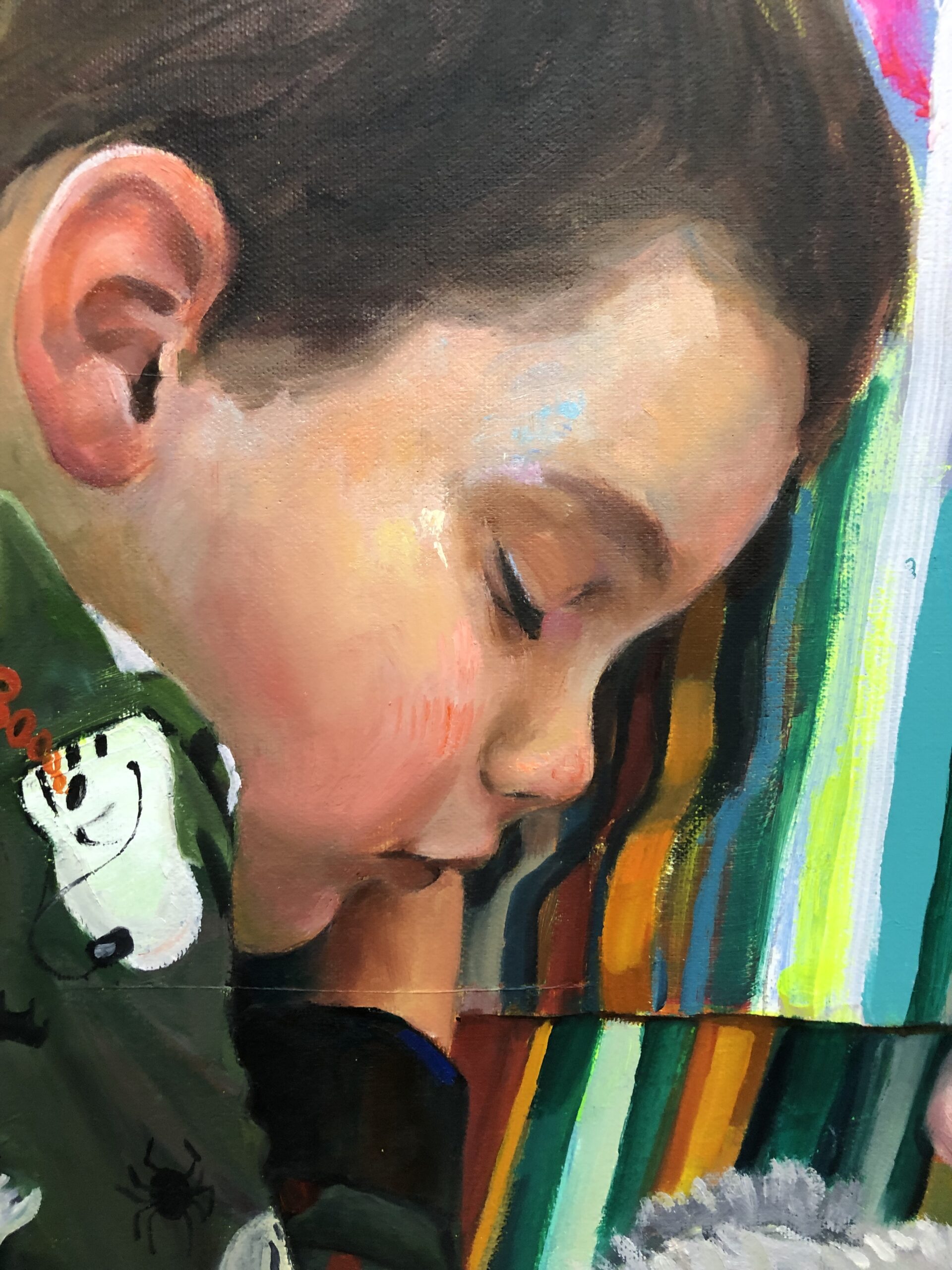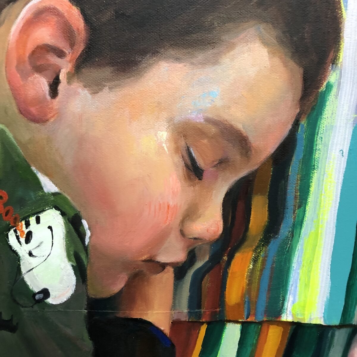 Lo he situado en una postura casi fetal; la sábana que se enrosca entre sus piernas funciona como un cordón umbilical y la cama parece flotar entre el color, a medio camino entre lo etéreo y el vientre materno. Su expresión serena, casi sagrada, contrasta con las pinceladas intensas de rosa, amarillo neón, azul y dorado que estallan a su alrededor: el caos mágico del mundo interior de la infancia.