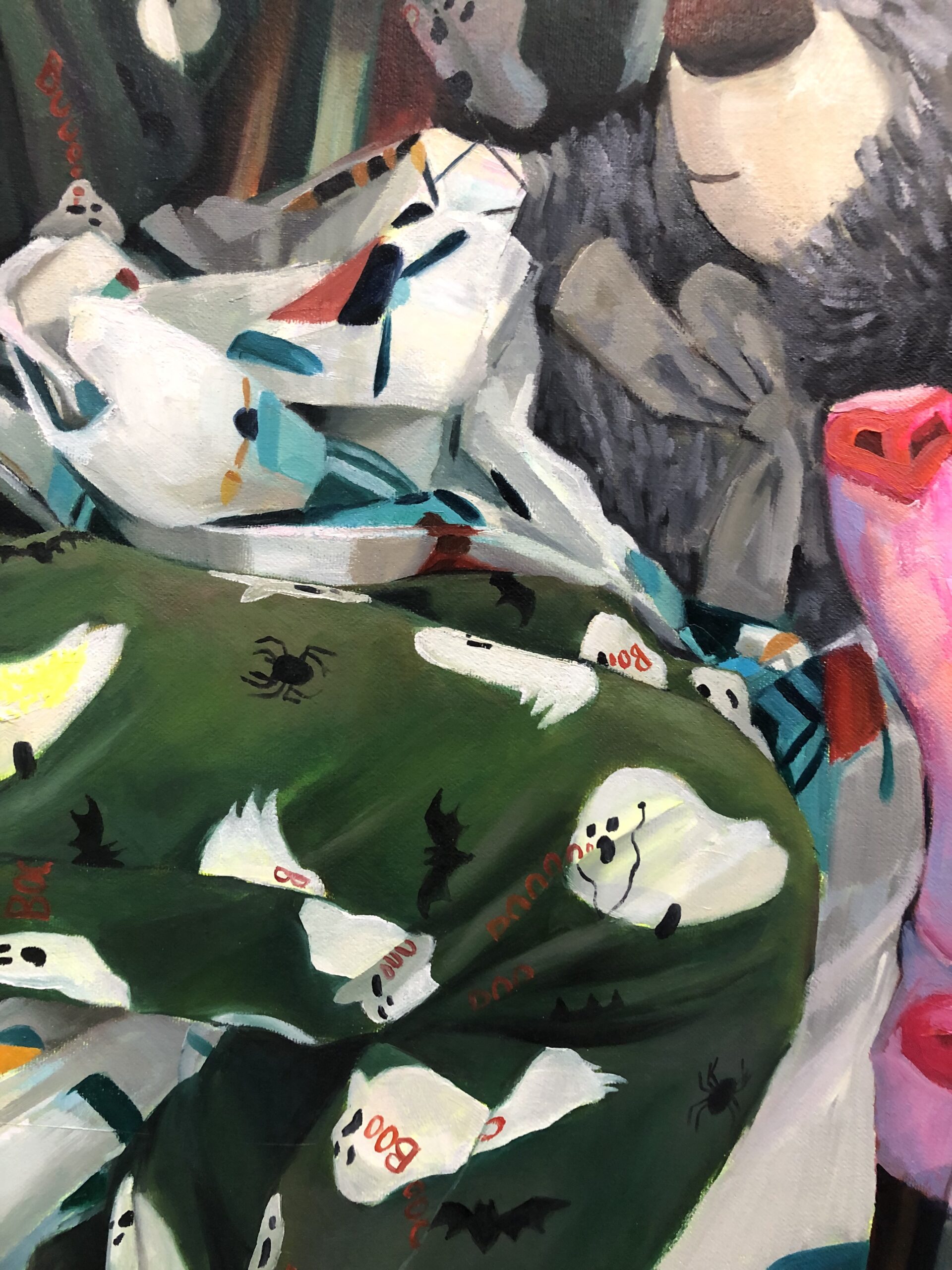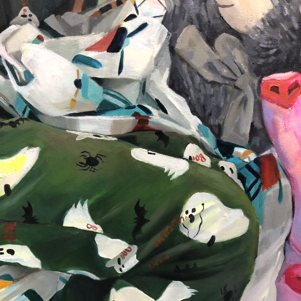 Nido es mi forma de capturar la pureza del sueño infantil dentro de un universo vibrante y onírico. Vuelvo a pintar a mi hijo Noel: aparece arropado por su pijama de fantasmitas y rodeado de esos peluches que, cuando somos pequeños, nos salvaguardan y protegen.