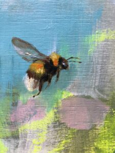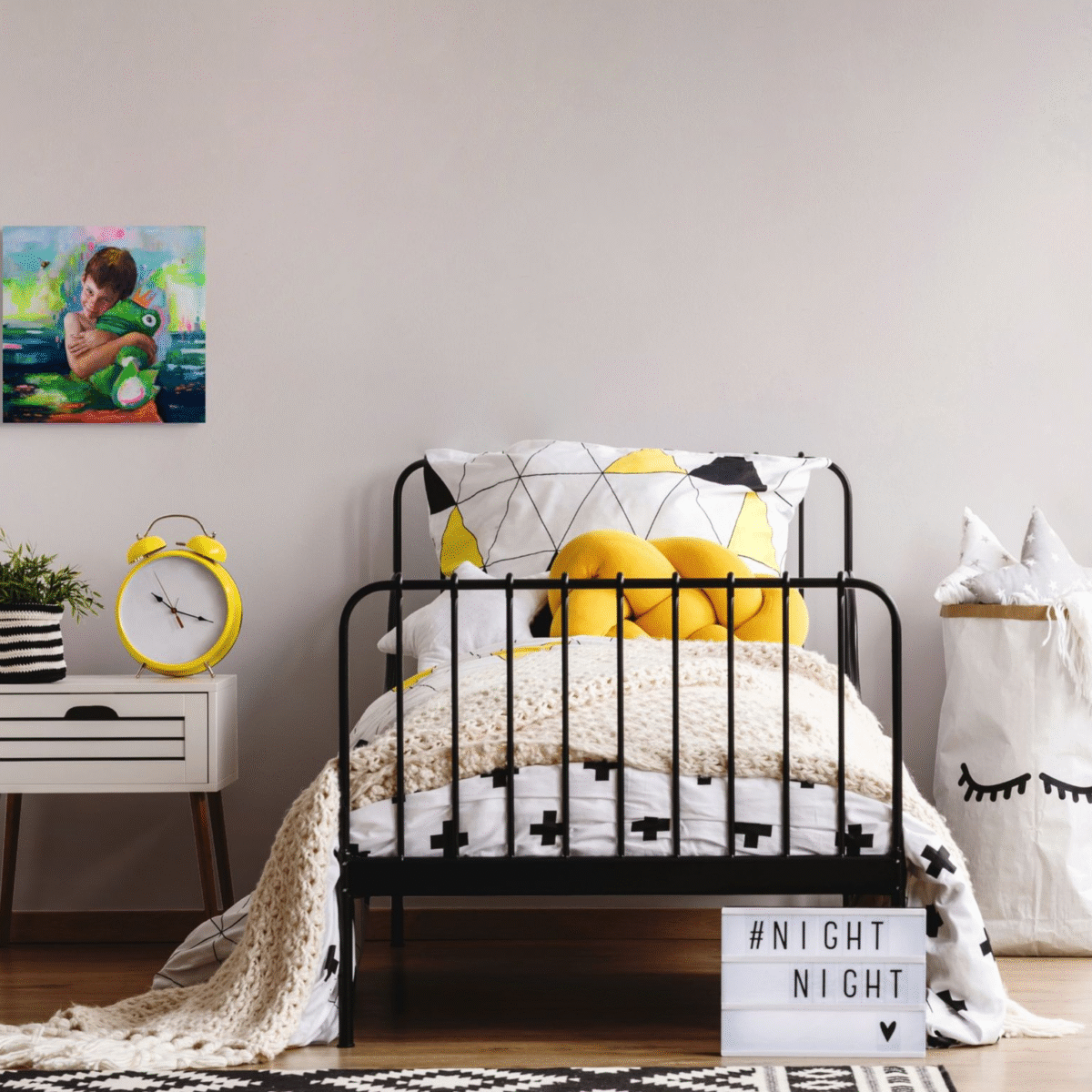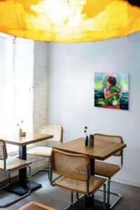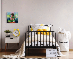 Sobre un fondo vibrante, casi onírico, el color late como emoción en bruto. Pinceladas sueltas y manchas fluyen con libertad, como si la propia pintura jugara. El gesto de Noel habla de amor incondicional, de esa etapa en la que un peluche puede ser rey y un niño, su mejor aliado.