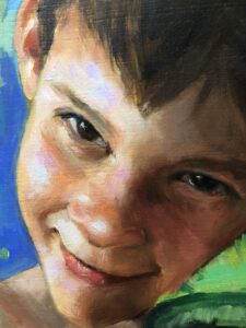 El príncipe rana forma parte de mi serie dedicada a la infancia en su estado más puro (El príncipe feliz, Excalibur, Nido) y vuelve a tener como protagonista a Noel, mi hijo: modelo, inspiración y espejo. En esta pintura la ternura se entrelaza con la fantasía; Noel abraza a su rana coronada y convierte lo cotidiano en un cuento. No hay filtros ni máscaras: todo es auténtico, desde la sonrisa apenas esbozada hasta la intensidad del abrazo.