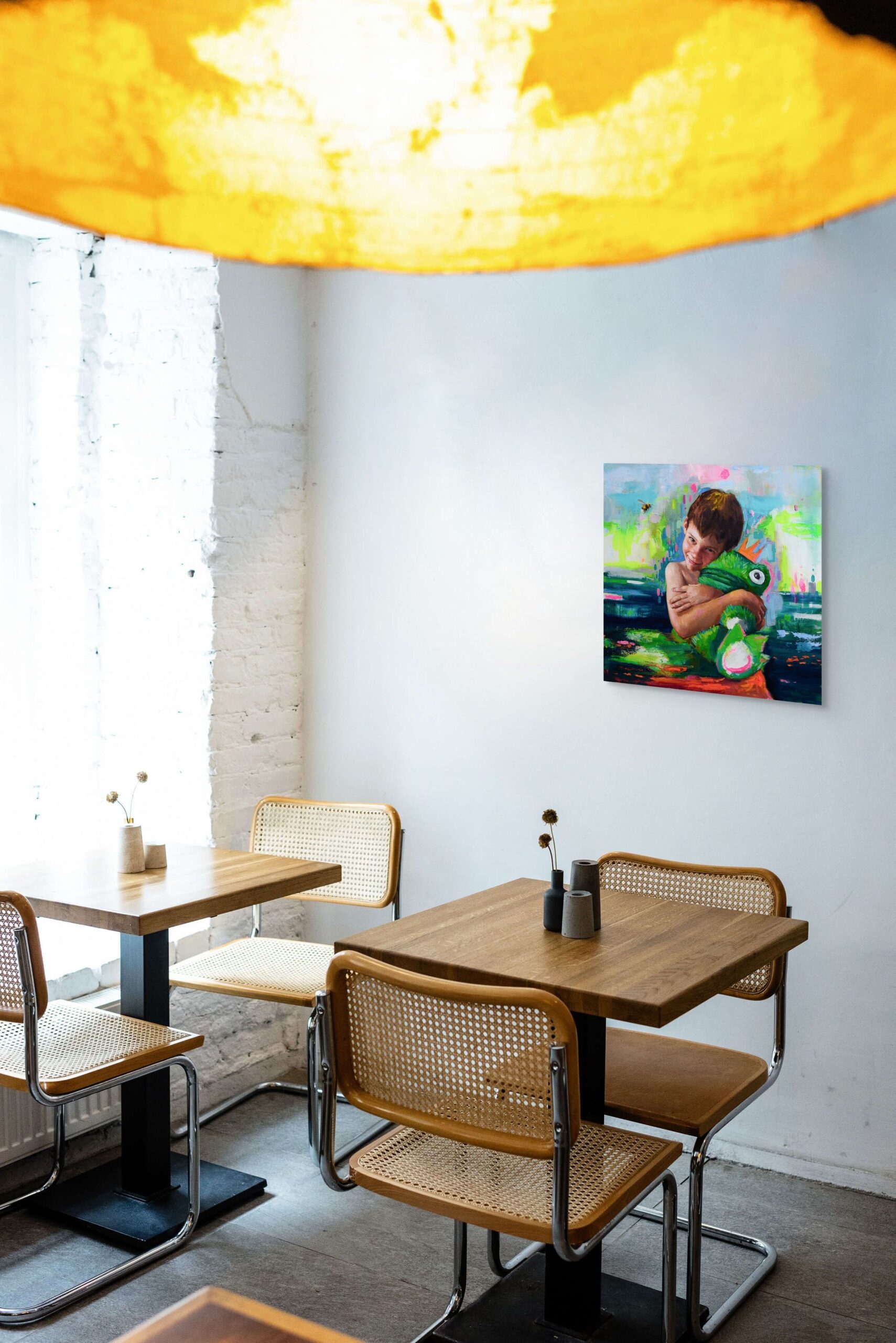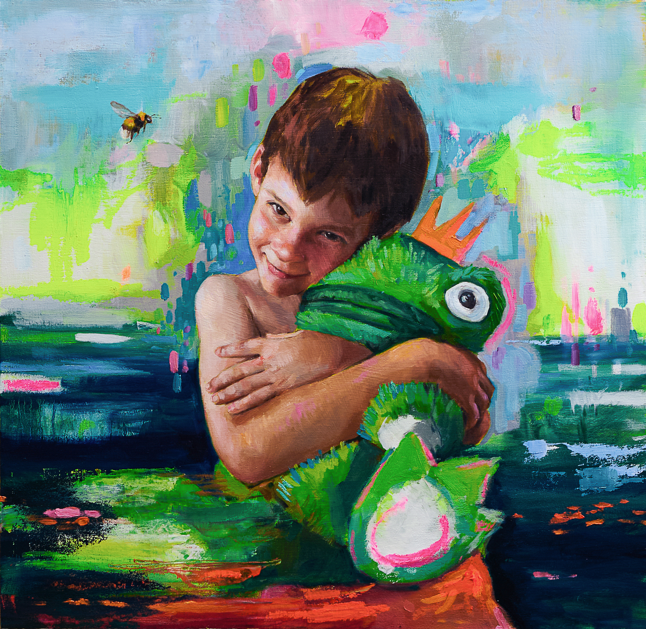 El príncipe rana forma parte de mi serie dedicada a la infancia en su estado más puro (El príncipe feliz, Excalibur, Nido) y vuelve a tener como protagonista a Noel, mi hijo: modelo, inspiración y espejo. En esta pintura la ternura se entrelaza con la fantasía; Noel abraza a su rana coronada y convierte lo cotidiano en un cuento. No hay filtros ni máscaras: todo es auténtico, desde la sonrisa apenas esbozada hasta la intensidad del abrazo.