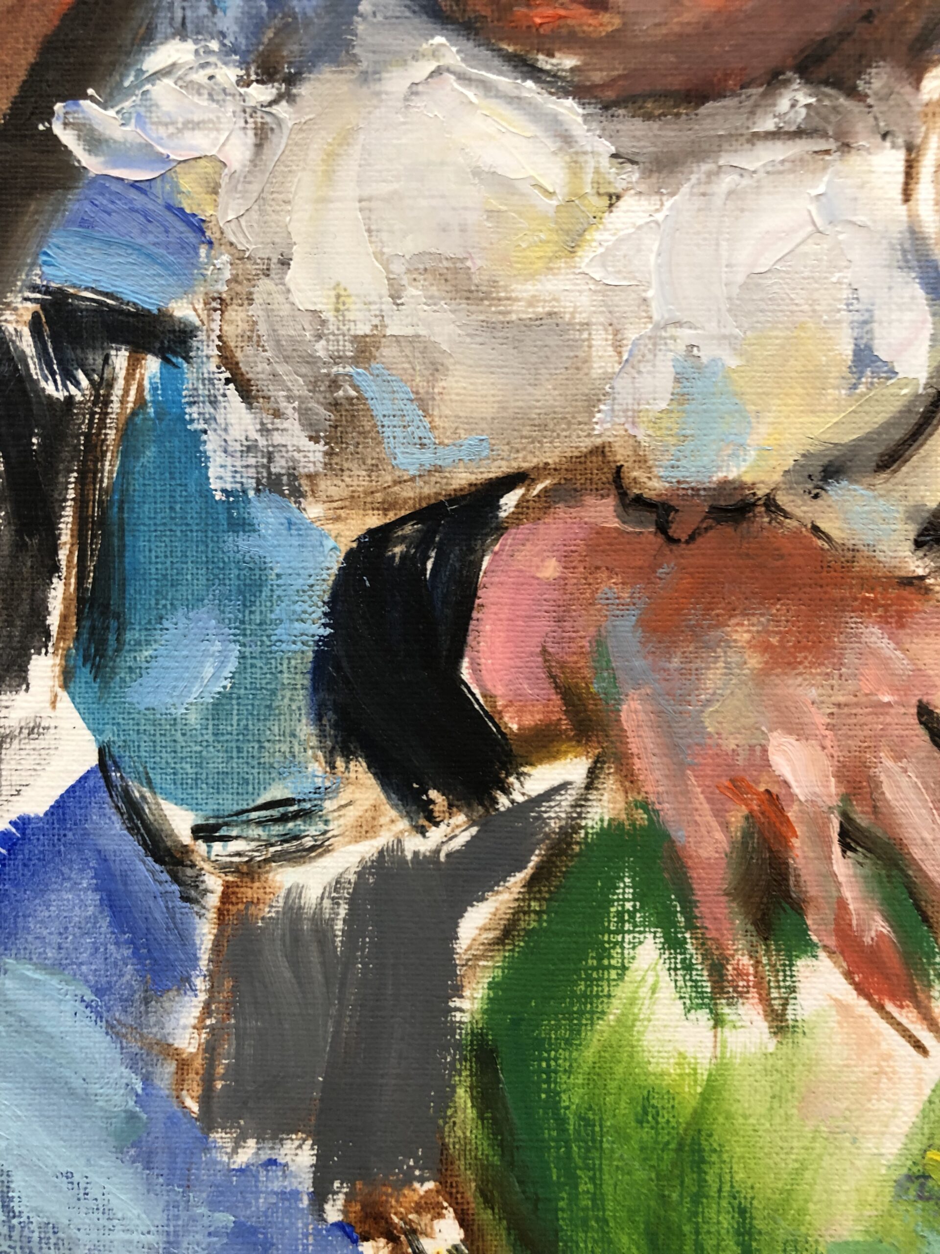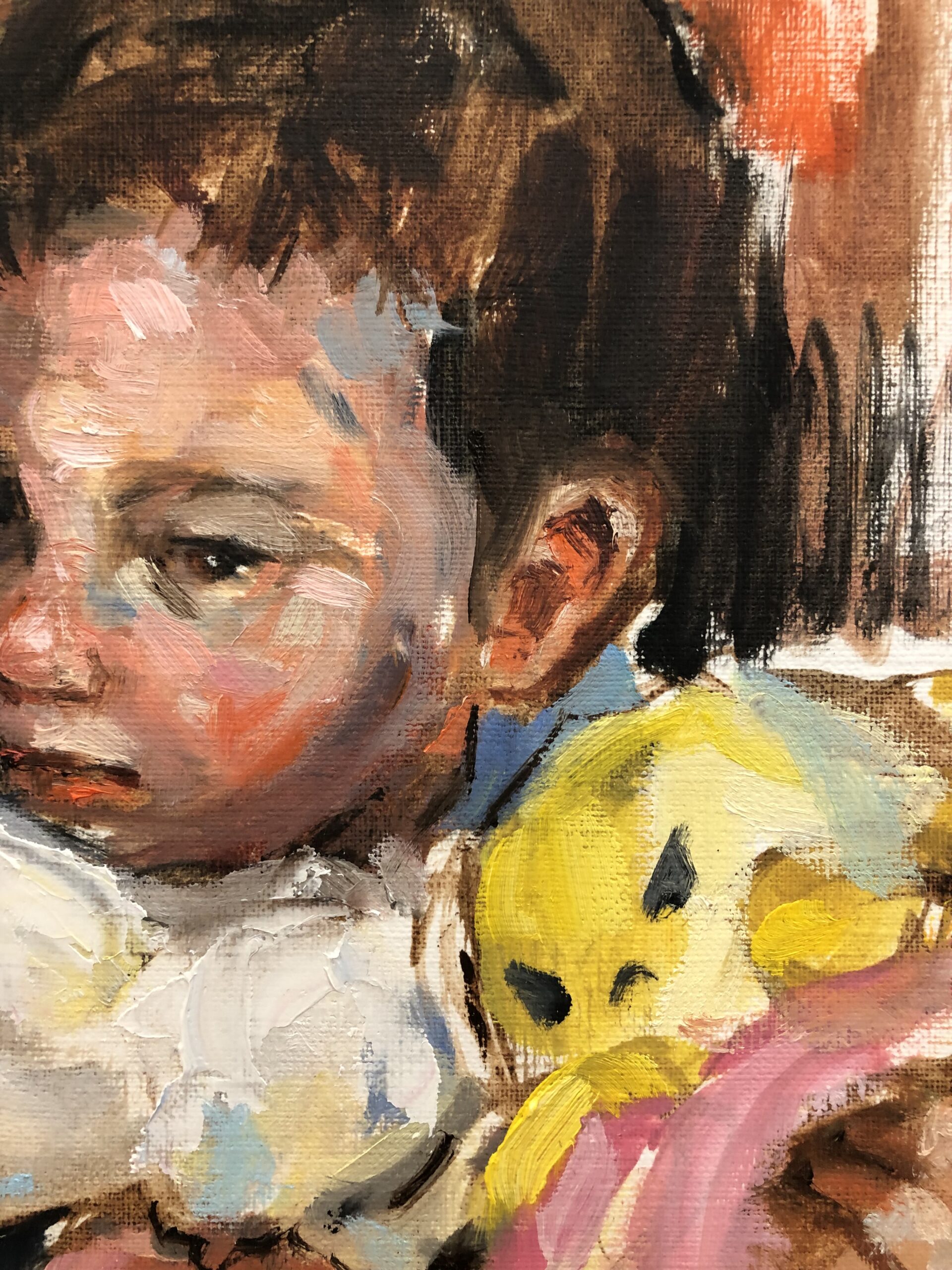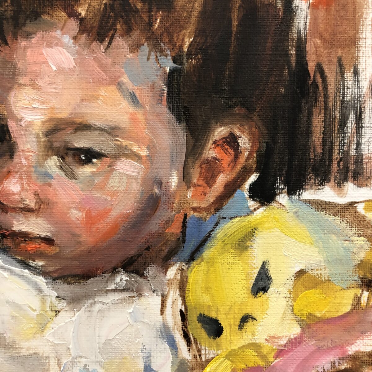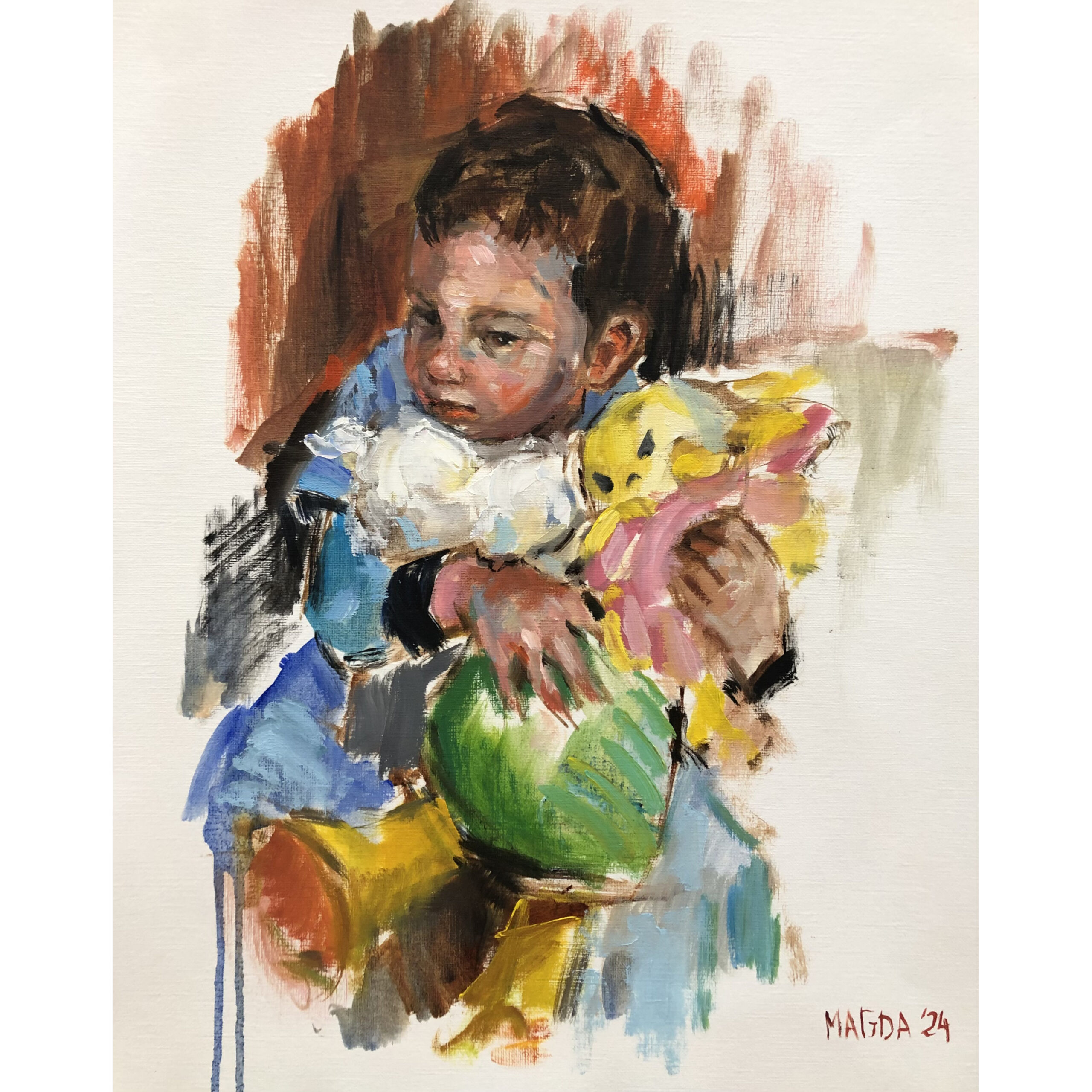 Tú me proteges es un boceto que surgió de esos apuntes rápidos con los que mantengo viva la frescura y la evolución constante de mi trabajo. Aquí retrato a mi hijo (aunque cuando lo dibujé él ya tenía cinco años, lo imaginé más pequeño) y, desde la distancia que dan la experiencia y la nostalgia, propongo otra mirada a la maternidad: en lugar de llamarme a mí, se refugia en sus peluches para espantar el miedo. Ese gesto infantil, tan tierno como revelador, deja un espacio abierto para que cada espectador complete la historia a su manera.
